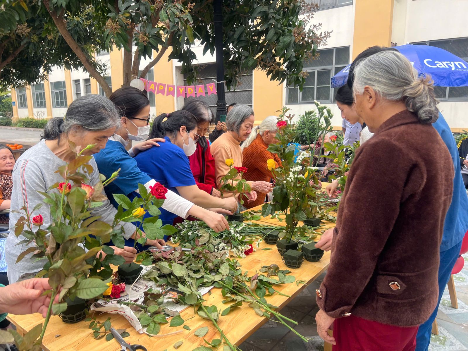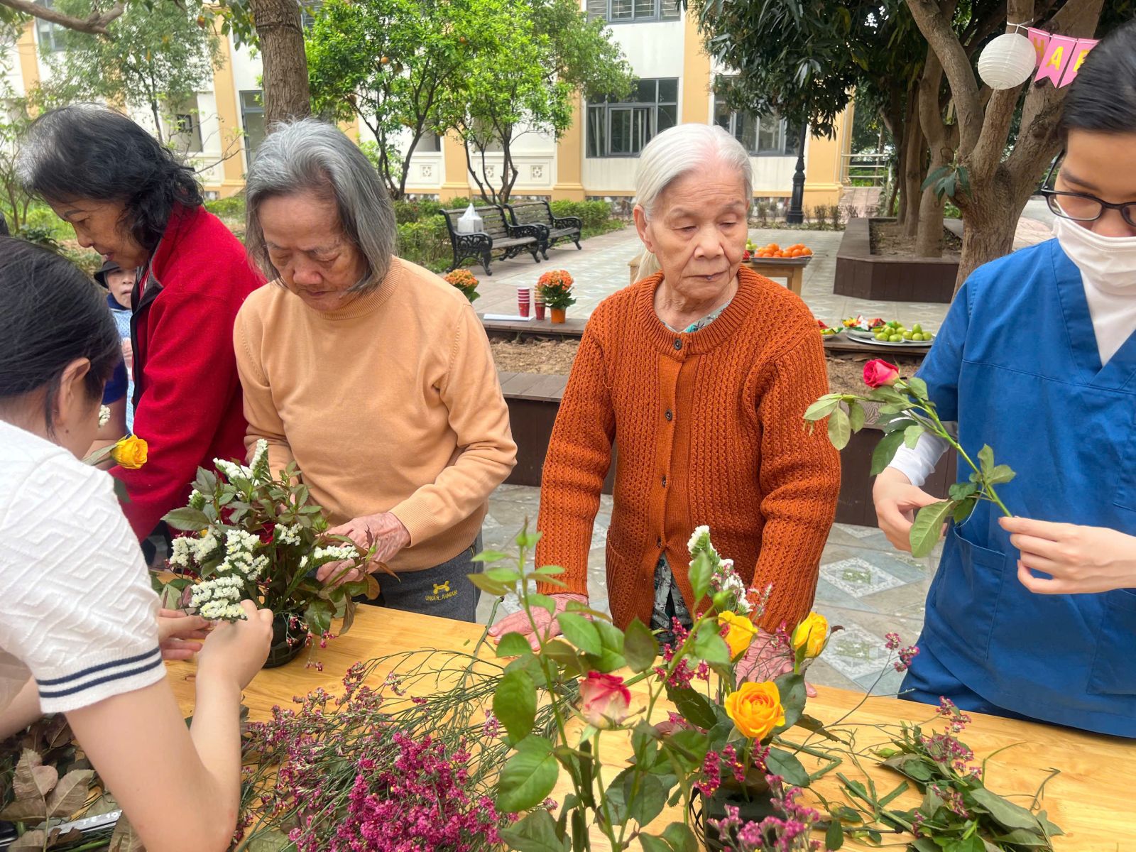 Người cao tuổi nữ hào hứng tham gia “Workshop cắm hoa cùng ông bà” dưới sự giúp đỡ, đồng hành tận tình của điều dưỡng.