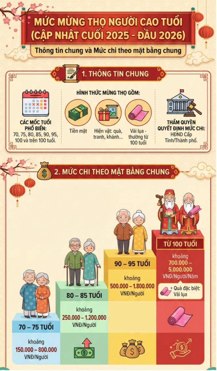 Cùng với việc hoàn thiện khung pháp lý về chúc thọ, mừng thọ người cao tuổi, nhiều địa phương trên cả nước đã chủ động ban hành hoặc lấy ý kiến đối với các nghị quyết quy định mức tiền mừng thọ dịp Tết Nguyên đán 2026, với mức chi ngày càng tăng, phù hợp điều kiện phát triển kinh tế – xã hội của từng địa bàn. Điểm chung dễ nhận thấy là chính sách được thiết kế theo hướng phân tầng theo độ tuổi, kết hợp hài hòa giữa tiền mặt và hiện vật mang ý nghĩa tinh thần, thể hiện sự trân trọng đối với người cao tuổi.