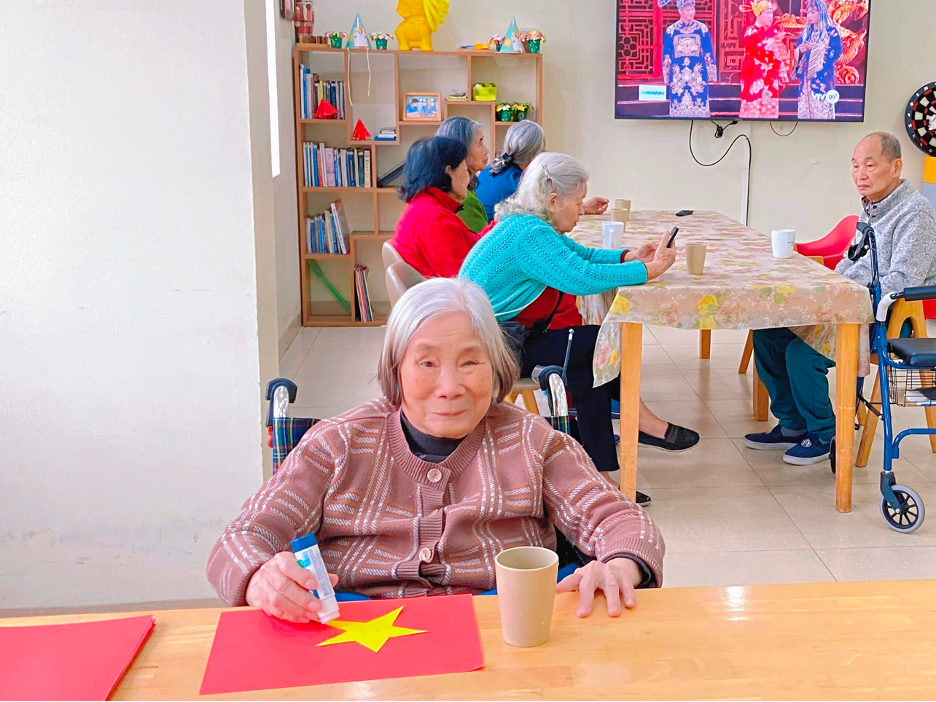 Ở phòng sinh hoạt chung, không khí rộn ràng hơn hẳn ngày thường. Mỗi người một việc: người cắt hình cờ, người dán ngôi sao,…. Nhịp làm việc chậm rãi, đều đặn, khác hẳn sự gấp gáp bên kia ngưỡng cửa nhà của Lotus Care. Thỉnh thoảng, câu chuyện về những ngày cầm cờ đi vận động, về buổi lễ độc lập hay những năm tháng kháng chiến lại được nhắc tới như một dòng chảy ký ức lặng lẽ len qua từng đường cắt.